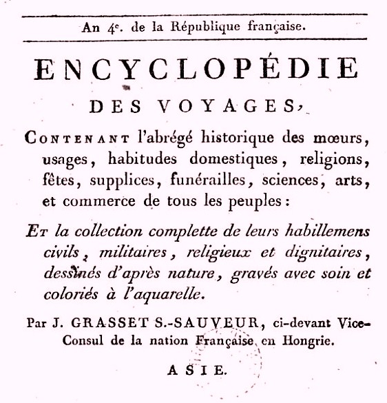 Jacques GRASSET SAINT-SAUVEUR (1757-1810) [1796], Encyclopédie des voyages contenant l’abrégé historique des moeurs, usages, habitudes domestiques, religions, fêtes, supplices, funérailles, sciences, arts, et commerce de tous les peuples : et la collection complette de leurs habillemens civils, militaires, religieux et dignitaires, dessinés d’après nature, gravés avec soin et coloriés à l’aquarelle, Paris, chez l’auteur et chez Deroy, 1796, vol.1 : Europe, 520p. ; vol.2 : Asie, 370p., in-8 (reprint Kissinger Legacy, 2010).