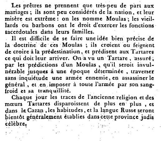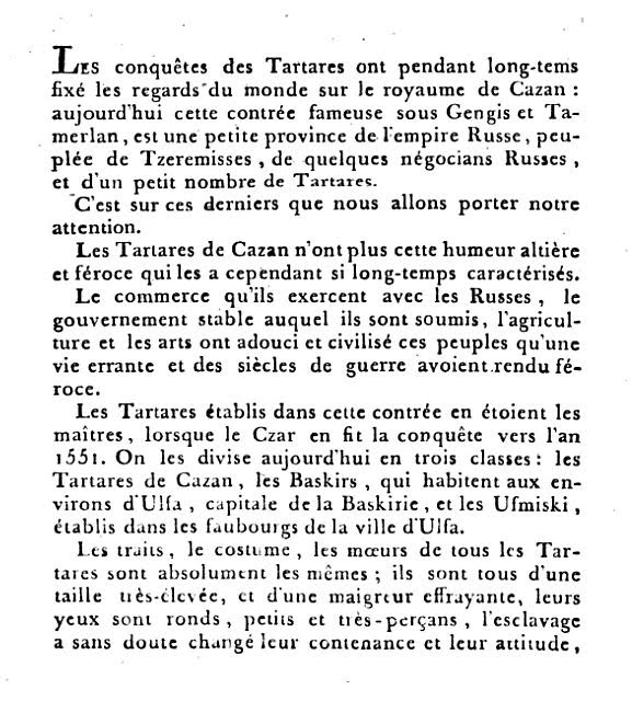 Dans le volume « Asie » de son «Encyclopédie des voyages contenant l’abrégé historique des moeurs, usages, habitudes domestiques, religions, fêtes, supplices, funérailles, sciences, arts, et commerce de tous les peuples (…) » publié en 1796, le polygraphe Grasset passe en revue, dans un curieux désordre, de très nombreux peuples d’Extrême-Orient, chacun décrit en quelques pages suivies de deux gravures aquarellées : un homme et une femme en « habillement civil, ou militaire, ou religieux, ou de dignitaire. ». Appartenant dans une large mesure au courant des Orientalistes, il s’est tout particulièrement attaché aux peuples musulmans, de la Barbarie (l’Afrique du Nord) à la Perse, des Tatars de Crimée aux Circassiens (et surtout aux Circassiennes, dont il chante, comme d’innombrables auteurs libertins, « l’incomparable beauté »), des Tatars de Kazan aux Tatars Ouzbeks. Le Grand Turc l’a tout particulièrement inspiré, y compris son conseiller militaire français, le célèbre comte de Bonneval, « pacha Trois queues« , mais aussi, bien sûr, les intrigues compliquées du Sérail et du Harem. Les considérations de Grasset sur les Tatars de Kazan, pour brèves qu’elles soient, ne manquent pas de pertinence (ci-dessous): il relève l’influence croissante de la Russie sur ces descendants des hordes turco-mongoles, et le rôle contrasté, mais plutôt déclinent, des « moulas » (mollahs) dont il évoque indirectement l’appartenance au chiisme.