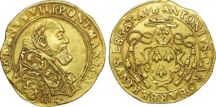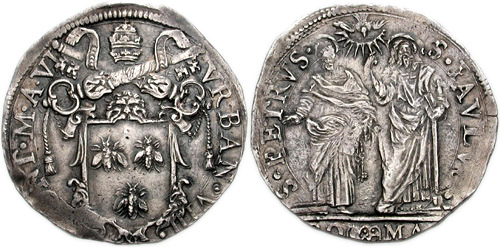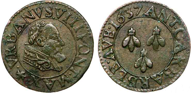 On retrouve ces trois abeilles sur des monnaies de la papauté romaine, sur des médailles, sur la chape du pape Urbain, sur de nombreux édifices romains (dont le Palais Barberini, édifié par Le Bernin), sur des enluminures, sur des livres, sur des armures, etc. Dites parfois « barberins« , les monnaies aux armes de Maffeo Barberini-Urbain VIII ont aussi été frappées en Avignon: depuis de simples doubles tournois (ou quattrino) en cuivre à de spectaculaires et rarissimes quadruples écus d’or.
