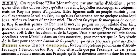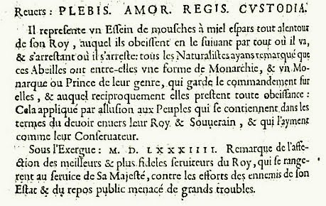 L’anthropomorphisme de la ruche monarchique à la Renaissance et à l’Epoque moderne est remarquablement illustré par les commentaires de l’époque sur ce jeton d’Henri III, dont le principe et la frappe ont été votés par les Etats de Bourgogne, dans le contexte très conflictuel rappelé ci-dessus. La province était déchirée entre les deux partis, mais les instances politiques, dont les Etats, penchaient très largement pour la Ligue catholique.