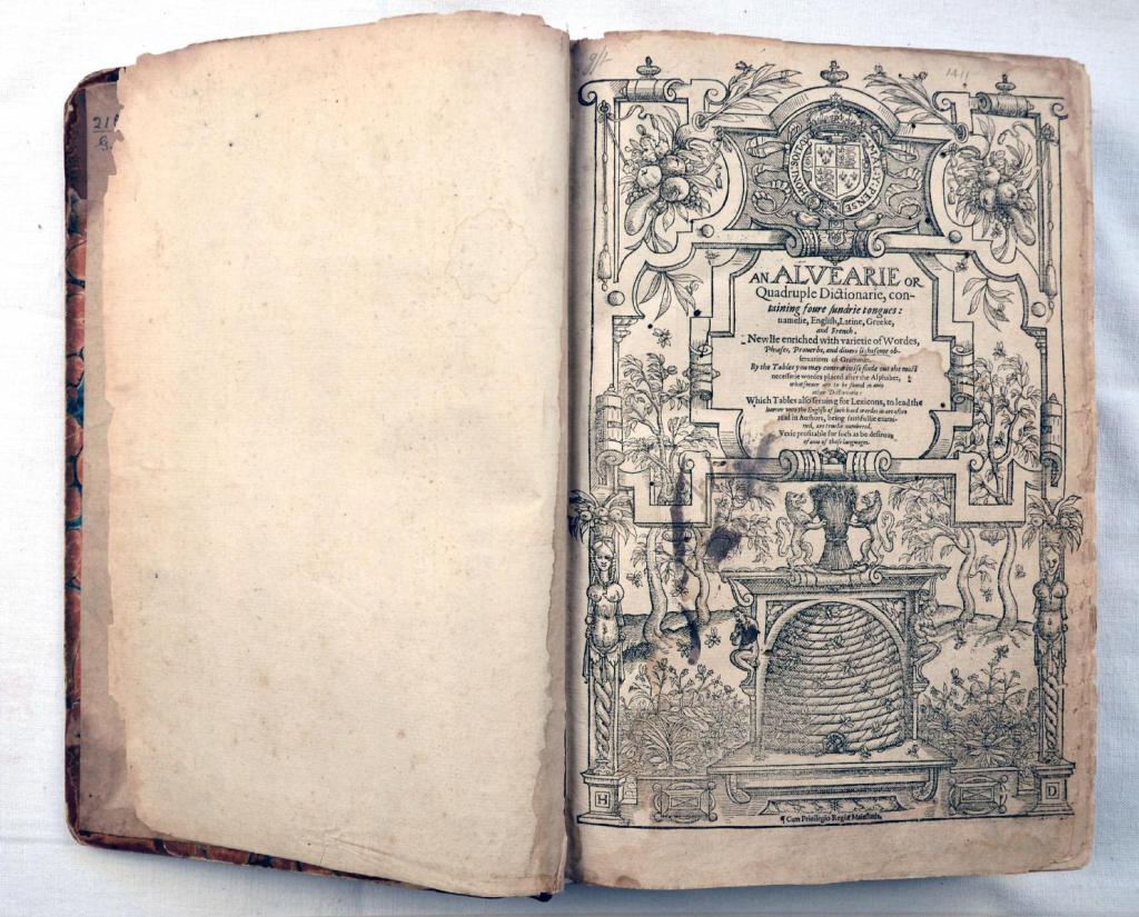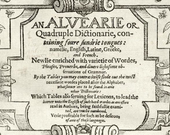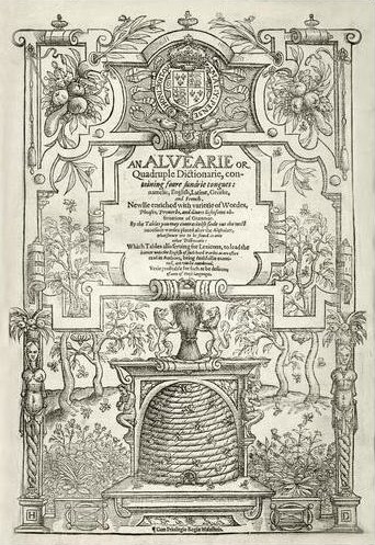 > Frontispice de John BARET, « An ALVEARIE or Quadruple Dictionarie, containing foure sundrie tongues: namelie English, Latine, Greeke, and French. Newlie enriched with varietie of Wordes, Phrases, Proverbs, and divers lightsome observations of Grammar … » [Une Ruche, ou Quadruple dictionnaire, renfermant quatre langues, savoir anglais, latin, grec et français. Nouvellement enrichi d’une variété de mots, phrases, proverbes et diverses observations grammaticales], Londini, excudebat Henricus Denhamus [à Londres, imprimé par Henry Denham], 1580