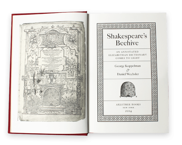 KOPPELMAN George, WECHSLER Daniel [2014], Shakespeare’s Beehive. An Annoteted Elizabethan Dictionary Comes to Light, New York, Axletree Books, 2014, 339p. Site dédié : http://shakespearesbeehive.com/