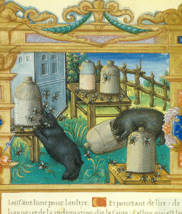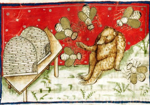 Au contraire des nombreuses enluminures inspirées d’Esope (cf. deux exemples ci-dessous), il est peu de monnaies, médailles ou jetons sur lesquels on relève la représentation de l’ours, animal sauvage et réputé glouton, bousculant les ruches, et se régalant de miel, tout en étant attaqué par les abeilles furieuses. La scène est toutefois présente sur ce jeton bruxellois du XVIIe siècle. Il semble que Gérard d’Oyenbrugge a émis ce jeton alors qu’après avoir été échevin dans les années 1620, il a échoué à l’élection comme bourgmestre en 1630, et en aurait conçu un certain mécontentement (voire un mécontentement certain !). Il n’accèdera à cette fonction qu’en 1635. L’interprétation du thème du jeton est discutée: l’ancien échevin entendait-il se comparer à l’ours, dont le pelage épais le protège des abeilles agressives de l’échevinage de Bruxelles?