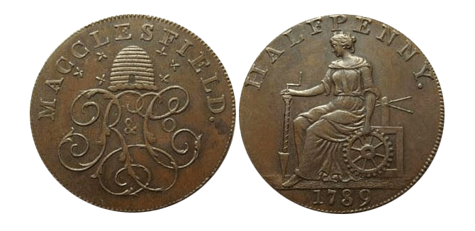 Halfpenny, jeton de cuivre émis à Macclesfield (Cheshire) en 1789, diamètre 29mm. Emetteur : Charles Roe & Co, célèbre propriétaire de mines et de fonderies de cuivre, un des acteurs majeurs de l’émission de jetons de cuivre. D&H-Cheshire no 14.