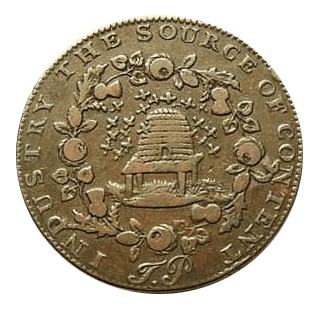 AVERS : Une ruche en paille (skep) sur un plateau, entourée d’abeilles. Légende circulaire: « INDUSTRY HAS ITS SURE REWARD *»