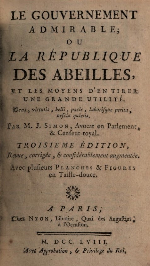 [Anonyme: SIMON Jean-Baptiste][1740], Le Gouvernement admirable, ou la République des abeilles Avec les moyens d’en tirer une grande utilité, à La Haye, chez Pierre de Hondt, 1740, 284p.Un deuxième tirage en Hollande existe « en vente à Paris, rue Saint-Jacques, chez Lambert et Durand », avec une gravure de frontispice différente. En ligne : http://books.google.fr/ebooks?id=6IRlAAAAMAAJ