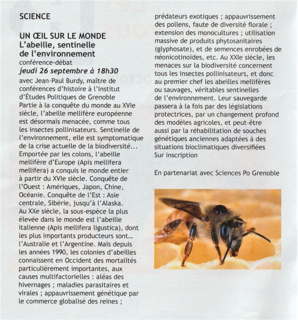 Résumé de la conférence introductive au débat / Emportée par les colons, l’abeille mellifère d’Europe (Apis mellifera mellifera) a conquis le monde entier à partir du XVIe siècle. Conquête de l’Ouest : Amériques, Japon, Chine, Océanie. Conquête de l’Est : Asie centrale, Sibérie, jusqu’à l’Alaska. Au XXe siècle, la sous-espèce la plus élevée dans le monde est l’abeille italienne (Apis mellifera ligustica), dont les plus importants producteurs sont… l’Australie et l’Argentine. Mais depuis les années 1990, les colonies d’abeilles connaissent en Occident des mortalités particulièrement importantes, aux causes multifactorielles : aléas des hivernages ; maladies parasitaires et virales ; appauvrissement génétique par le commerce globalisé des reines; prédateurs exotiques ; appauvrissement des pollens, faute de diversité florale ; extension des monocultures ; utilisation massive de produits phytosanitaires (glyphosate), et de semences enrobées de néonicotinoïdes, etc. Au XXIe siècle, les menaces sur la biodiversité concernent tous les insectes pollinisateurs, et donc au premier chef les abeilles mellifères ou sauvages, véritables sentinelles de l’environnement. Leur sauvegarde passera à la fois par des législations protectrices, par un changement profond des modèles agricoles, et peut-être aussi par la réhabilitation de souches génétiques anciennes adaptées à des situations bioclimatiques diversifiées.