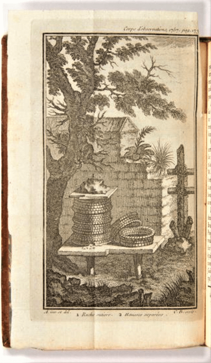 1757-1758 : (éd.) Corps d’observations de la Société d’Agriculture, de Commerce & des Arts, établie par les États de Bretagne  [avec une ruche en planche initiale…]