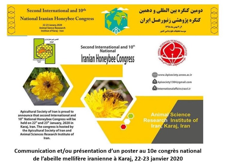 NB: les tensions politiques du moment en Iran nous ont empêché d’être présent physiquement au congrès de Karaj, sinon à travers notre poster, présenté le 23 janvier par notre collègue Pegah Valizadeh, docteure en Biologie et immunologie de l’abeille, professeure-assistante au Département de la recherche sur l’abeille mellifère de l’Animal Science Research Institute of Iran (ASRI), à Karaj, et responsable des relations internationales de la Société d’apiculture iranienne. Nous la remercions de nous avoir représenté.