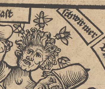 On retrouve cette image des abeilles autour d’une tête sur plusieurs autres gravures. Par exemple, dans une intention inverse à celle de Cocleus, dans une gravure anonyme de 1517 caricaturant Johannes Tecelius (Johann Tetzel, ou Hans Tietz, 1465-1519), célèbre dominicain anti-luthérien, en train de vendre des indulgences en Allemagne pour terminer la construction de la basilique Saint-Pierre de Rome. Grand propagateur des tourments du Purgatoire et des souffrances des pêcheurs, il serait l’auteur des deux célèbres vers : « Sitôt que sonne votre obole/ Du feu brûlant l’âme s’envole ». Dès janvier 1518, Tetzel avait répondu aux 95 thèses de Luther d’octobre 1517 par 100 anti-thèses. On sait que le trafic des indulgences a été au cœur des critiques de Luther contre l’Eglise de Rome à partir de 1517. D’autres gravures représentent Tetzel avec les vêtements constellés d’abeilles, confortant la thématique des abeilles harcelantes.