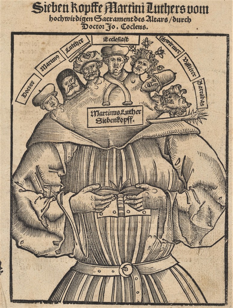 « Sieben Köpffe Martini Luthers / Martinvs Lvter Septiceps » [Les sept têtes de Martin Luther], bois gravé de Hans BROSAMER, frontispice de : Doctor Johann COCLEUS (1479-1552), Septiceps Lutherus… / Sieben Köpffe Martini Luthers von hochwirdigen Sacrament des Altars… , Leipzig, chez Valentin Schumann, 1529, éd.bilingue latin-allemand, rééd. 1564.
