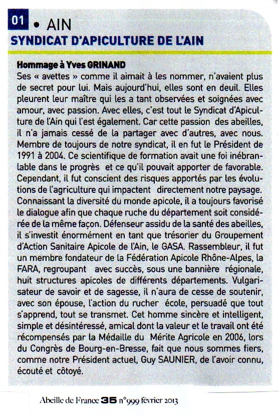 Nous rendons ici hommage à Yves « Yvon » Grinand, qui nous a initié à l’apiculture dans les années 1960-1970, dans ses ruchers de Villebois en Bugey (Ain), et à son épouse Andrée…