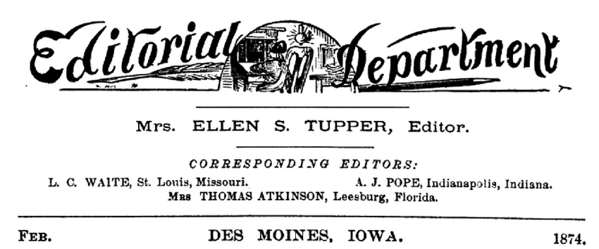 Ellen Tupper est désormais engagée dans une importante activité éditoriale6. Gagnant en notoriété régionale puis nationale (elle est parfois surnommée « la reine des abeilles de l’Iowa », ou « la femme-abeille », elle multiplie courriers7, chroniques et articles dans la presse généraliste (en particulier le Prairie Farmer)8 puis, de plus en plus, dans la presse apicole régionale et nationale9. En 1869, elle devient l’une des rédactrices du Bee-Keepers’ Journal (ensuite The Bee-Keepers’ Journal and National Agriculturist). En 1873, elle rachète le National Bee Journal, et en devient rédactrice en chef à Des Moines. Le journal fusionne rapidement avec l’American Bee Journal (ABJ), mensuel créé en 1861 par Samuel Wagner, et dont l’éditeur, la Charles Dadant Co. est à la fois à Chicago (Illinois) et à Cedar Rapids (Iowa). De 1873 à 1875, Ellen S.Tupper est donc co-rédactrice en chef et éditorialiste de l’ABJ. Elle est la première femme à occuper de telles responsabilités éditoriales dans le monde apicole. Elle y souligne les avantages des ruches à cadres mobiles, et les qualités des abeilles italiennes – deux innovations dans les Etats-Unis de l’époque. Elle a aussi traité des théories de l’apiculteur lusacien Jan Dzierzon 10. Au total, plus de 200 articles signés d’Ellen Tupper sur les abeilles ont pu être recensés en deux décennies, sans compter les articles anonymes ou sous pseudonymes.