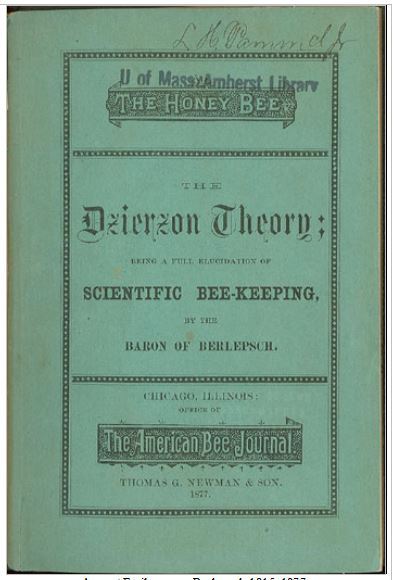 11 Cf. Von BERLEPSCH baron August [1861/1877/1882], The Dzierzon Theory; Being a Full Elucidation of Scientific Bee-keeping, en feuilleton dans la première année de l’American Bee Journal,Chicago, 1861; retraduit en 1877 par Samuel WAGNER ; The Dzierzon theory; or The fundamental principles of Dzierzon’s system of bee-culture, as set forth by the Baron of Berlepsch, The American Bee Journal, Chicago, 1877 .