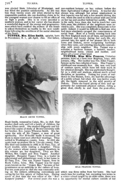 La vie d’Ellen Smith Tupper n’a pas été banale. Militante tempérante et suffragiste, elle a menée de front une multitude d’activités, dont plusieurs ont été pionnières à son époque – première rédactrice en chef d’un magazine d’apiculture, première enseignante d’apiculture et membre d’une société nationale d’entomologie. Même si la fin de sa vie a été ternie par des problèmes judiciaires liés à ses déboires financiers dans l’élevage de reines d’abeilles italiennes, elle est entrée dans la galerie des « femmes américaines pionnières »