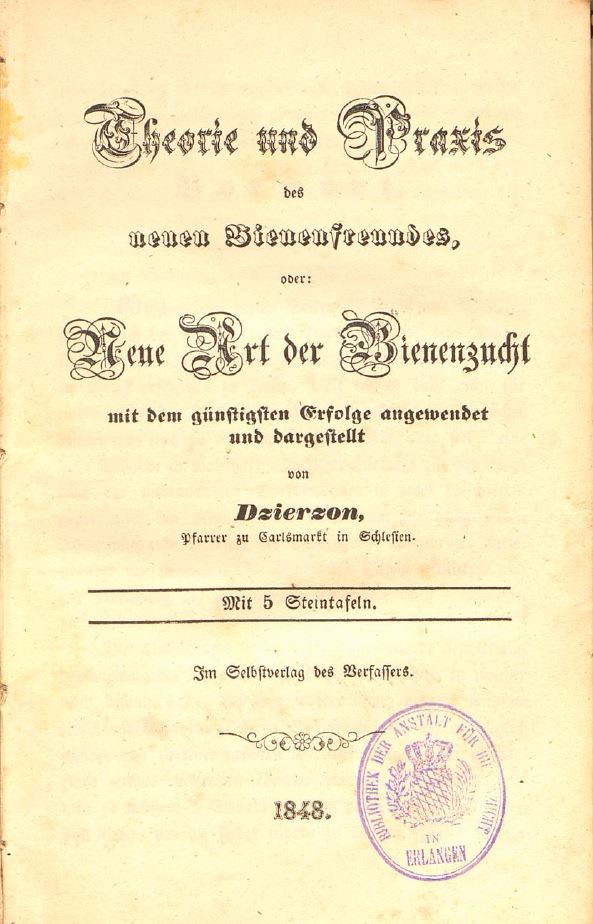 DZIERZON Jan [1847/1848/1851/1852] (1811-1906), Theorie und Praxis des neuen Bienenfreundes, von Bruckisch (éd.), 1847, 1848, 304 pages (*Facs*); Nachtrag zur Theorie und Praxis des neuen Bienenfreundes, oder einer Neuen Art der Bienenzucht mit dem günstigsten Erfolge angewendet und dargestellt, Nördlingen, C.H. Beck’sche Buchhandlung, 1851.