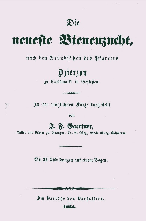 GÄRTNER J.F. [1854], Die neueste Bienenzucht nach den Grundsätzen des Pfarrers Dzierzon zu Carlsmarkt in Schlesien. 1854, 30p..