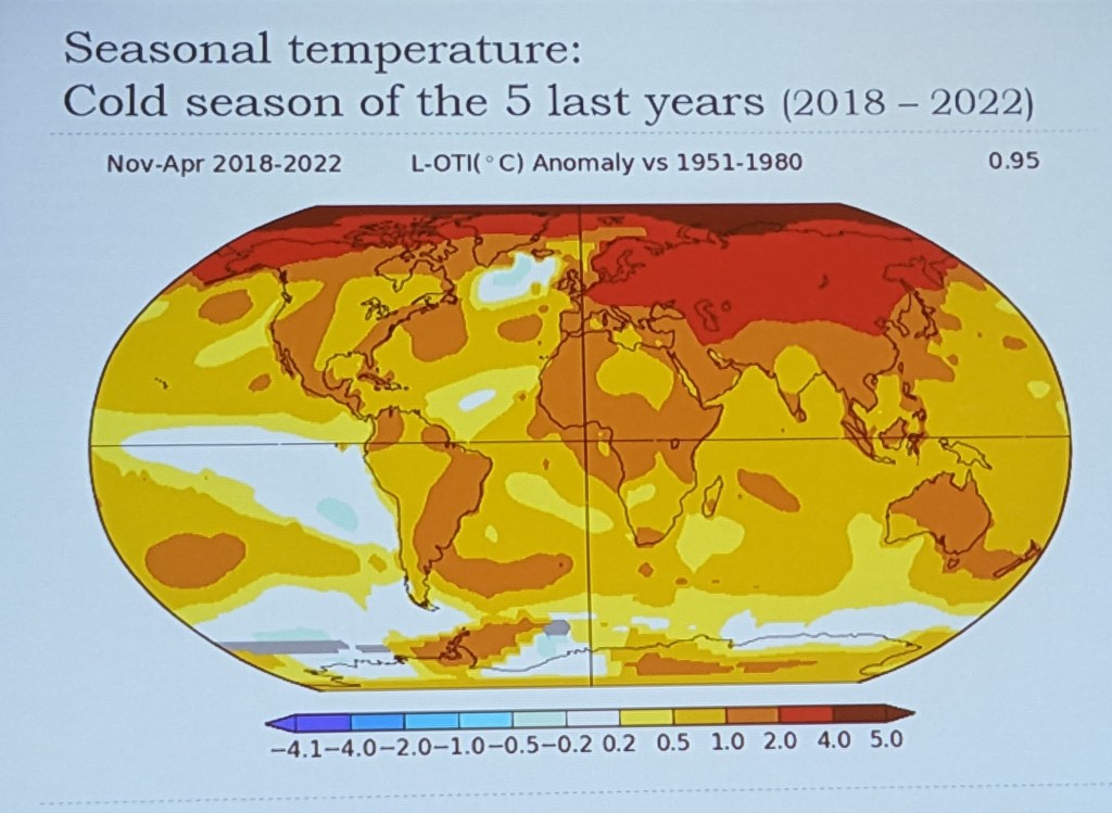 Le changement climatique anthropocène impacte la biodiversité, donc les abeilles, et donc l’apiculture. Cette thématique n’est pas, là non plus, nouvelle dans les débats d’Apimondia. Mais la montée en puissance des conséquences du changement climatique lui donne à chaque congrès une acuité accrue. La session a été ouverte par une longue intervention d’Etienne Bruneau (CARI, Belgique), qui s’est appuyé sur cartes, diagrammes et autres courbes pour souligner que le réchauffement, désormais incontestable, est nettement plus marqué dans l’hémisphère nord.