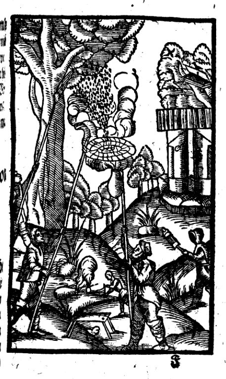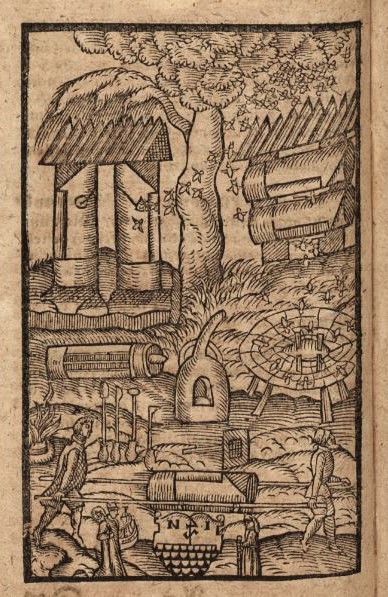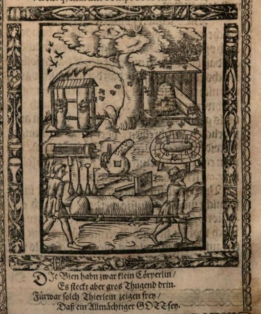 Le « Gründlicher und nützlicher Unterricht von der Bienen und ihrer Wartung (usw.) [1]» de Nickel Jacob (1505-1576), publié en 1568 à Görlitz, est connu pour être le premier manuel d’apiculture imprimé en allemand, et pour ses cinq bois gravés montrant des scènes d’opérations apicoles. Dans les deux siècles suivants, il a été maintes fois réédité [2] . L’un des bois gravés, au premier plan duquel on voit l’auteur et son père transporter une ruche, représente plusieurs types de ruches, des couteaux de récolte et, au centre de la scène, un enfumoir en poterie, assez sommairement dessiné.