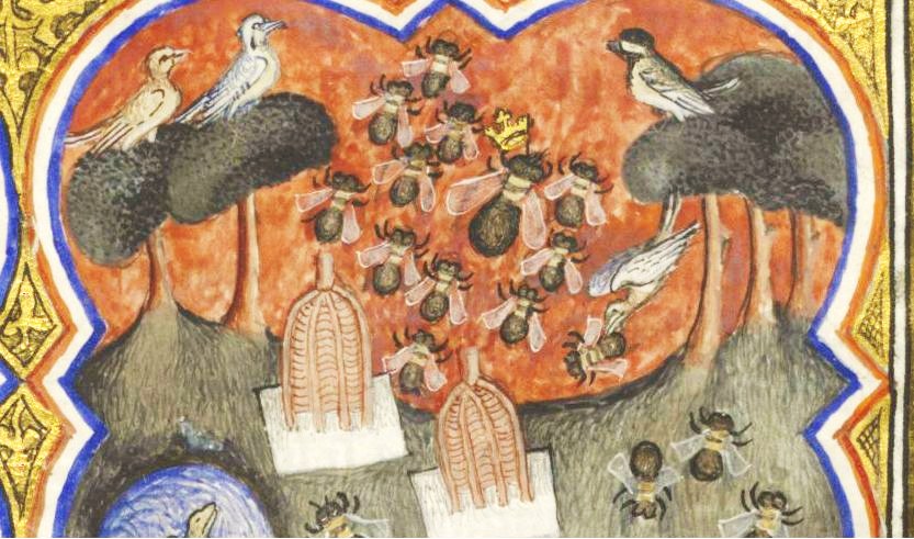 1372 – Le roi de France Charles V le Sage fait traduire et enluminer pour sa Librairie le «Bien universel des mouches à miel », rédigé vers 1260 par le dominicain du Brabant Thomas de Cantimpré.